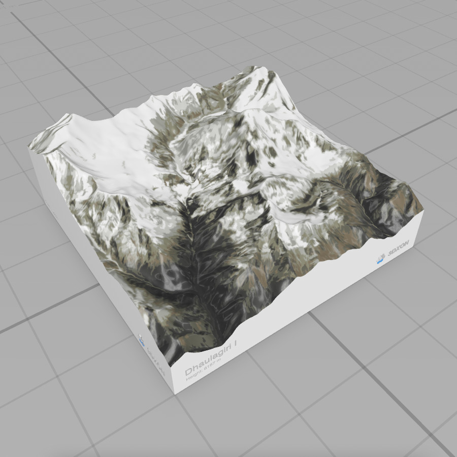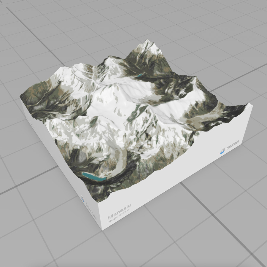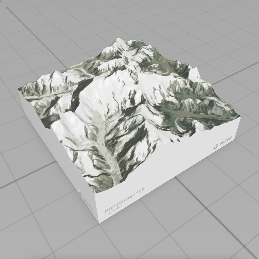 The AR peak model has a painted texture which resembles its natural look. Unlike the geographic maps, here you don't see any artificial labels stampped on the terrain. Instead you can toggle 3D AR markers to see geographic details as the peaks names.