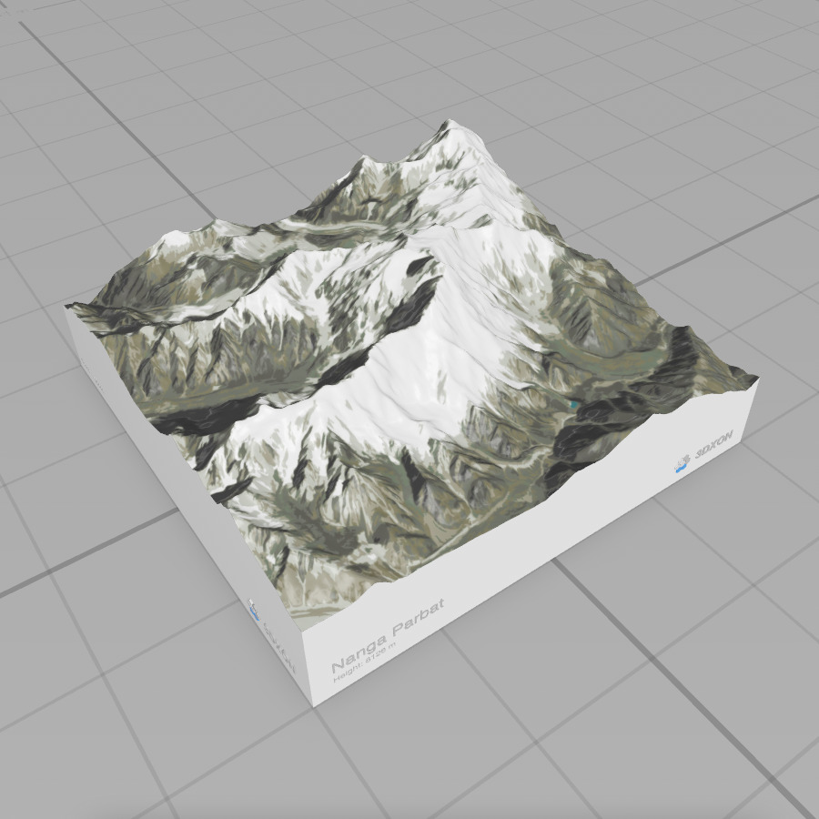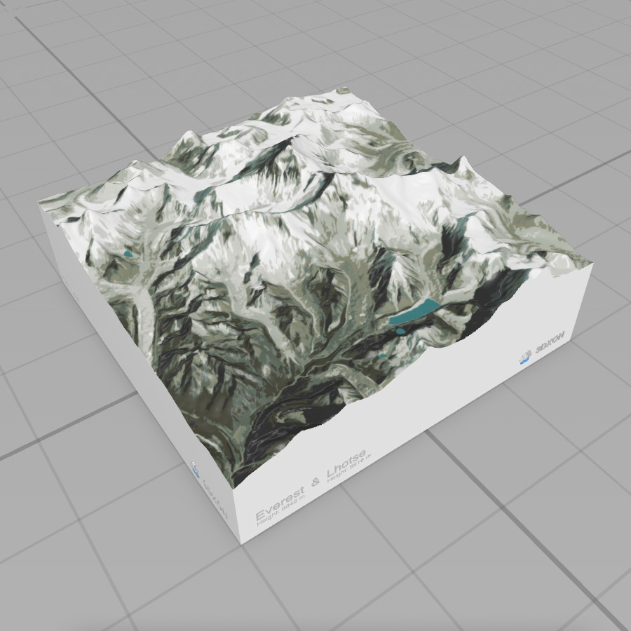 The peak model has a precise scale, which is displayed on the East and West sides of the model block. It tells the size of the peak model compared to the size of the same area on Earth. For example 1:50000 means that each centimeter of the model resembles 50000 centimeters (500 m) on Earth. All the models are 40cm by 40cm blocks in AR.