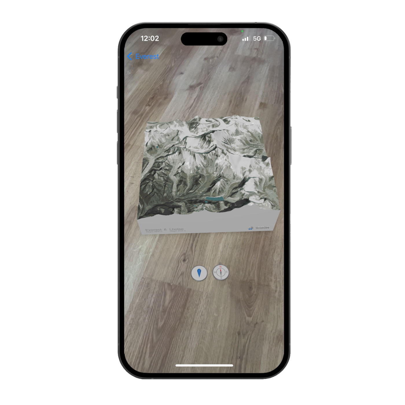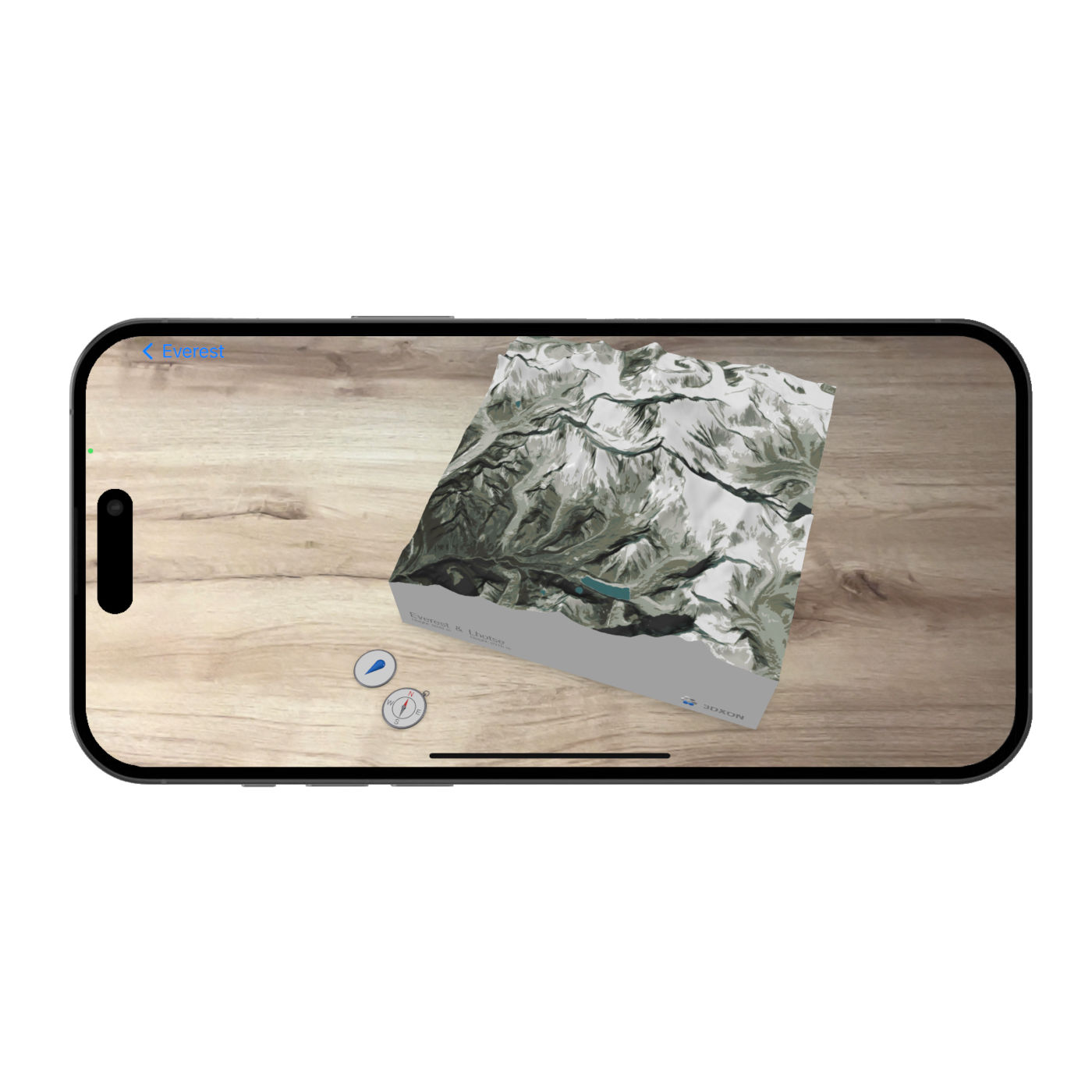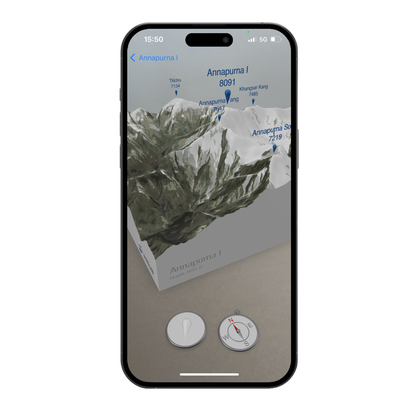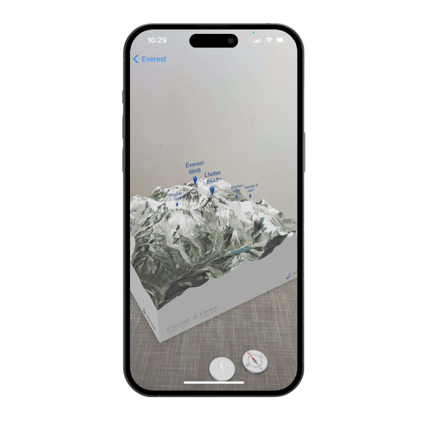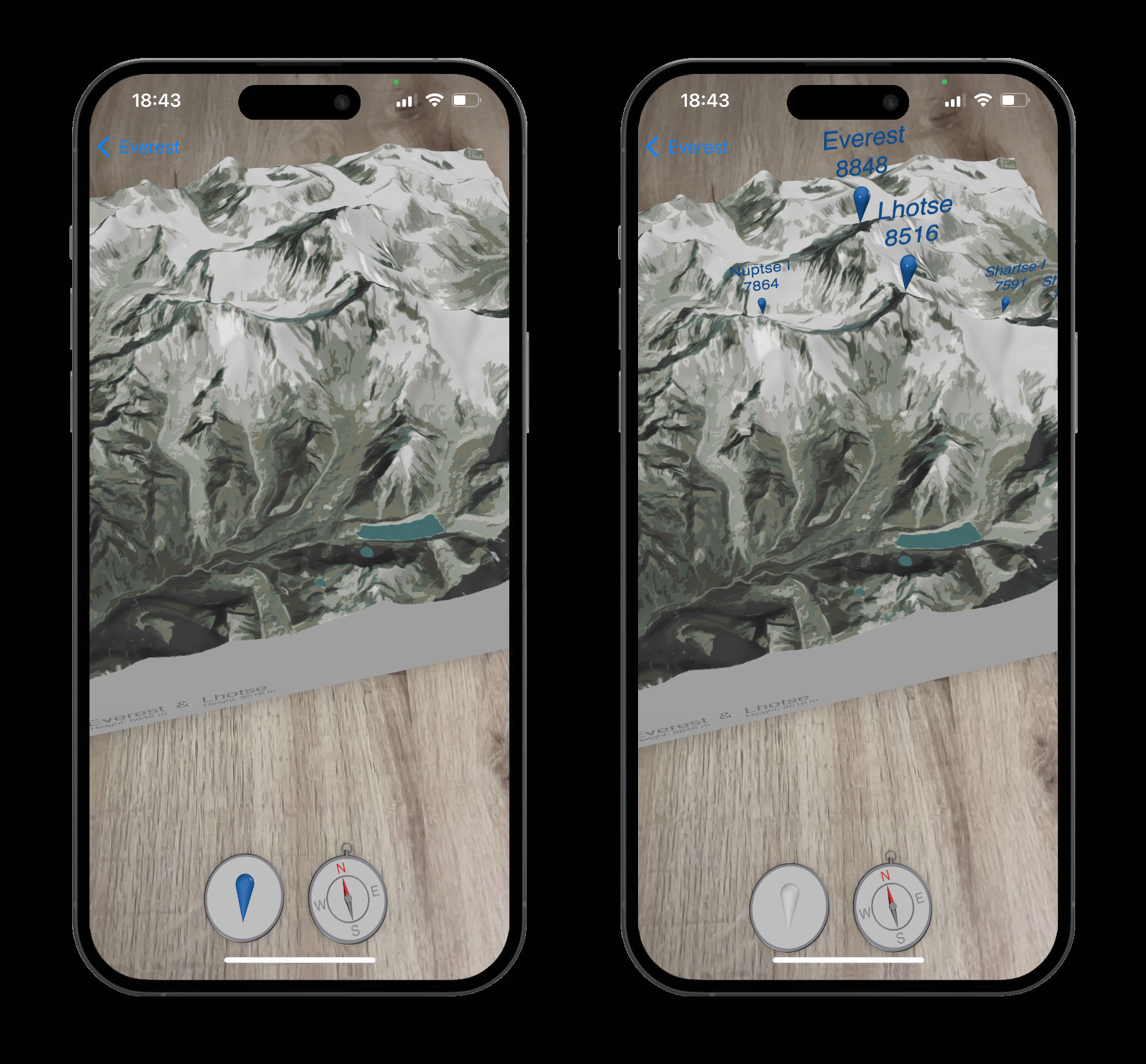 The AR peak model has a painted texture which resembles its natural look. Unlike the geographic maps, here you don't see any artificial labels stampped on the terrain. Instead you can toggle 3D AR markers to see geographic details as the peaks names.