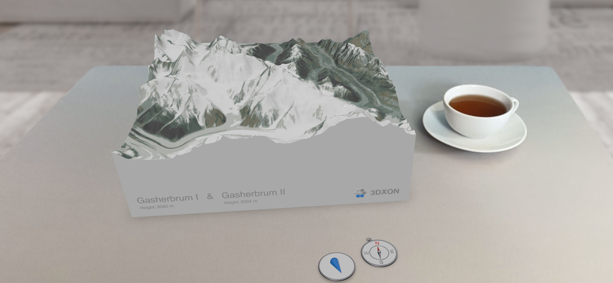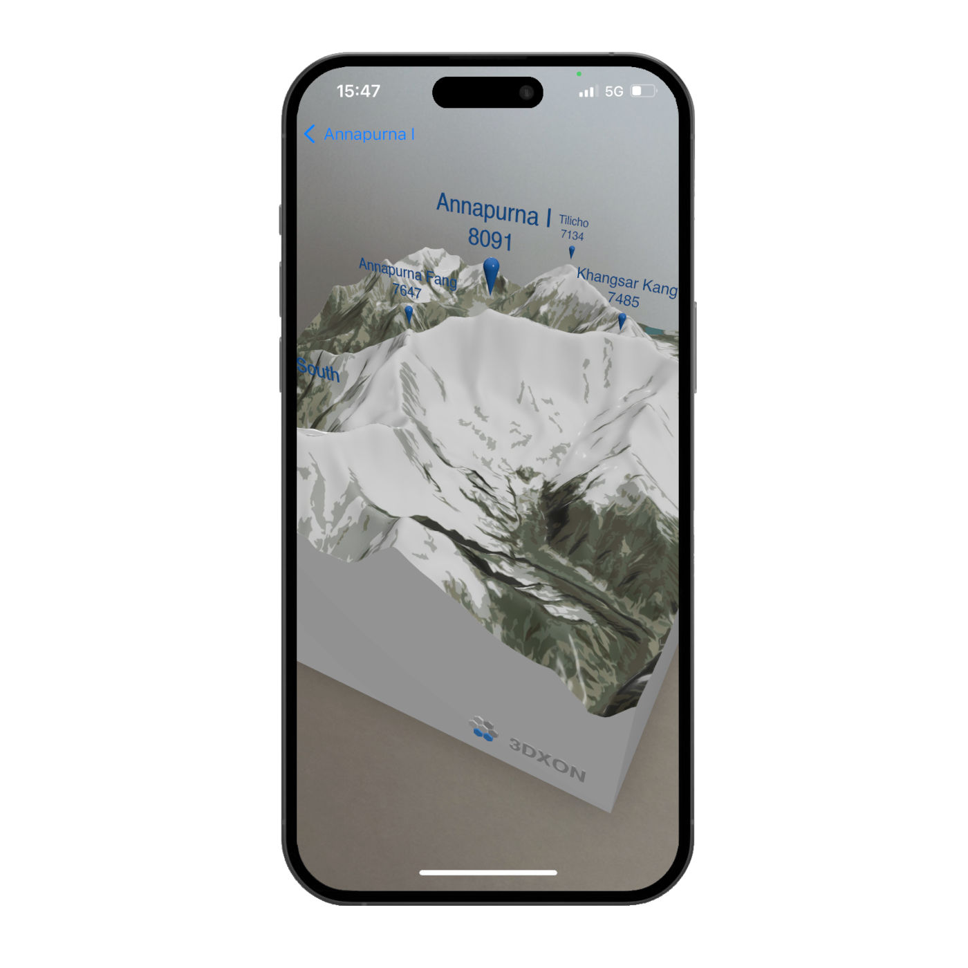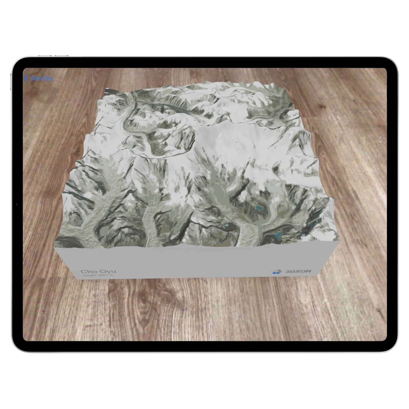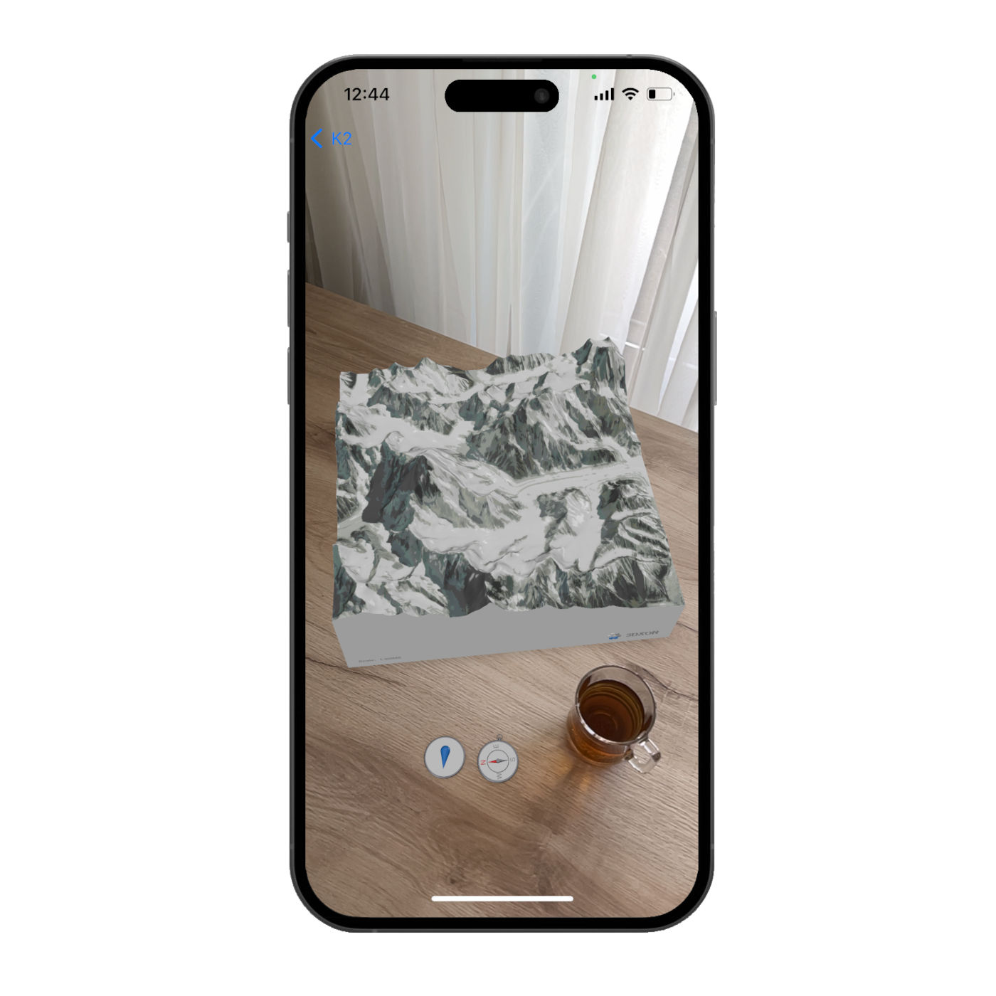 The AR peak model has a painted texture which resembles its natural look. Unlike the geographic maps, here you don't see any artificial labels stampped on the terrain. Instead you can toggle 3D AR markers to see geographic details as the peaks names.