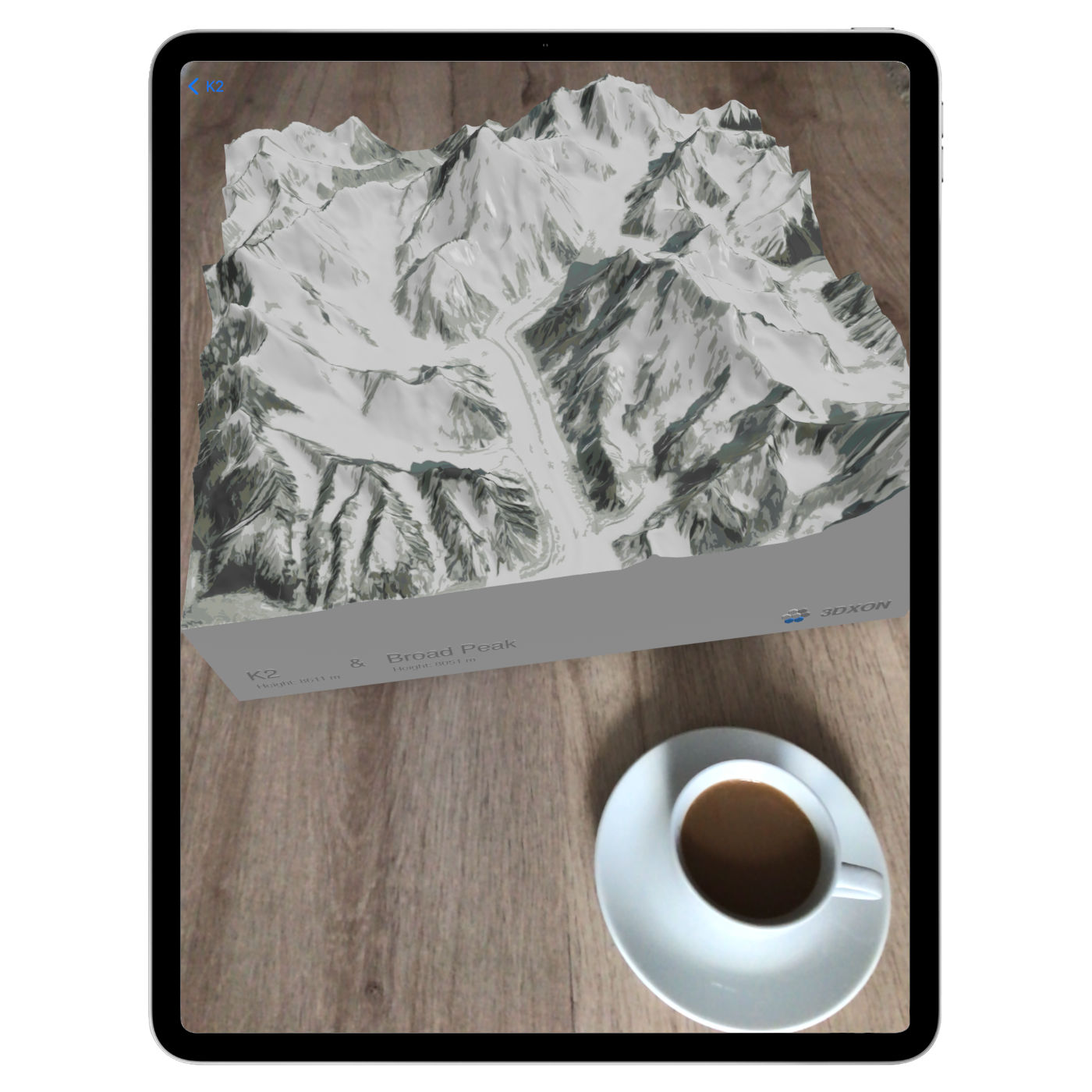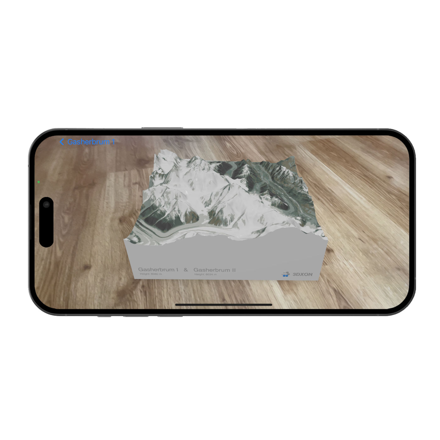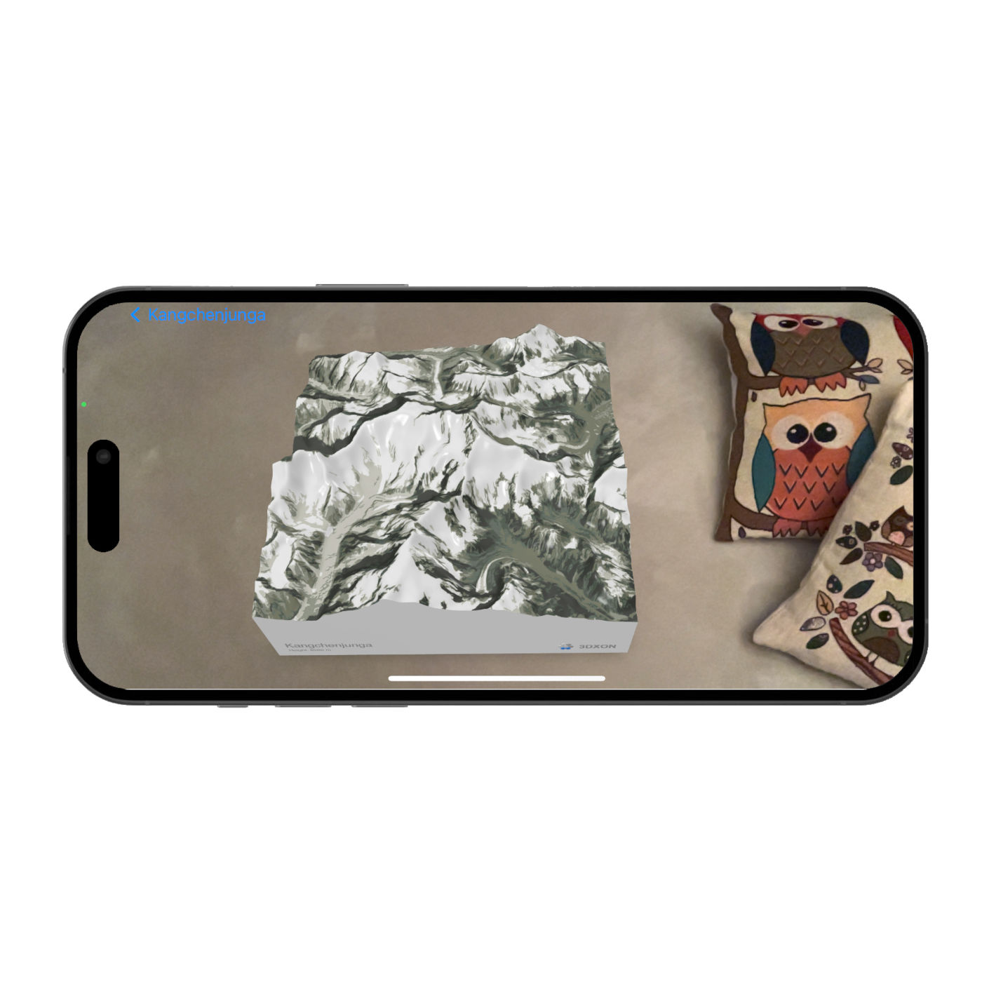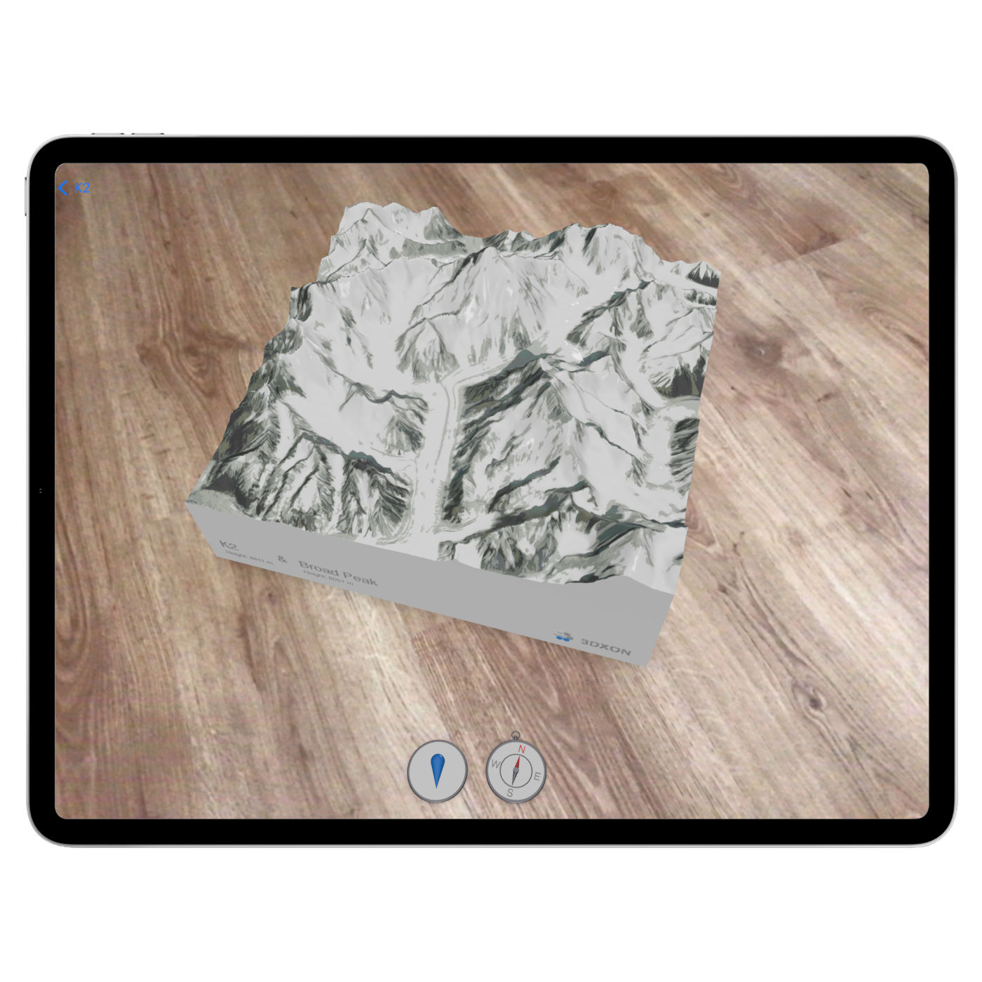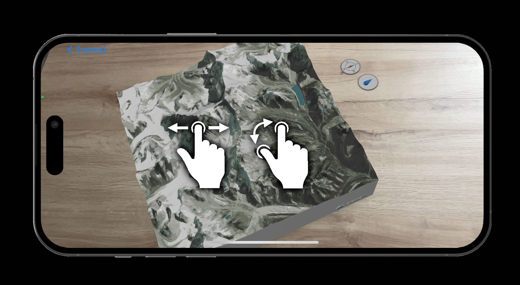 The AR peak model has a painted texture which resembles its natural look. Unlike the geographic maps, here you don't see any artificial labels stampped on the terrain. Instead you can toggle 3D AR markers to see geographic details as the peaks names.