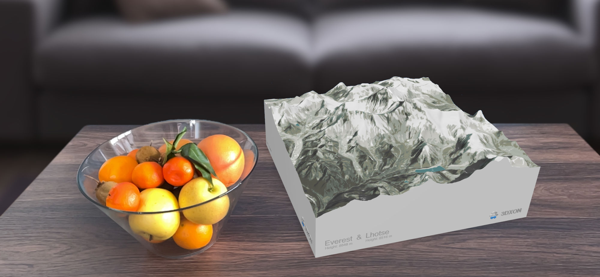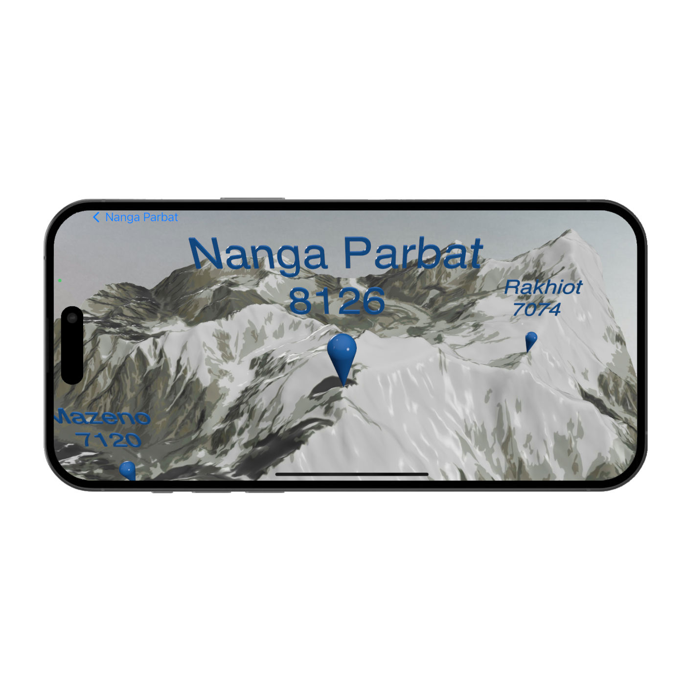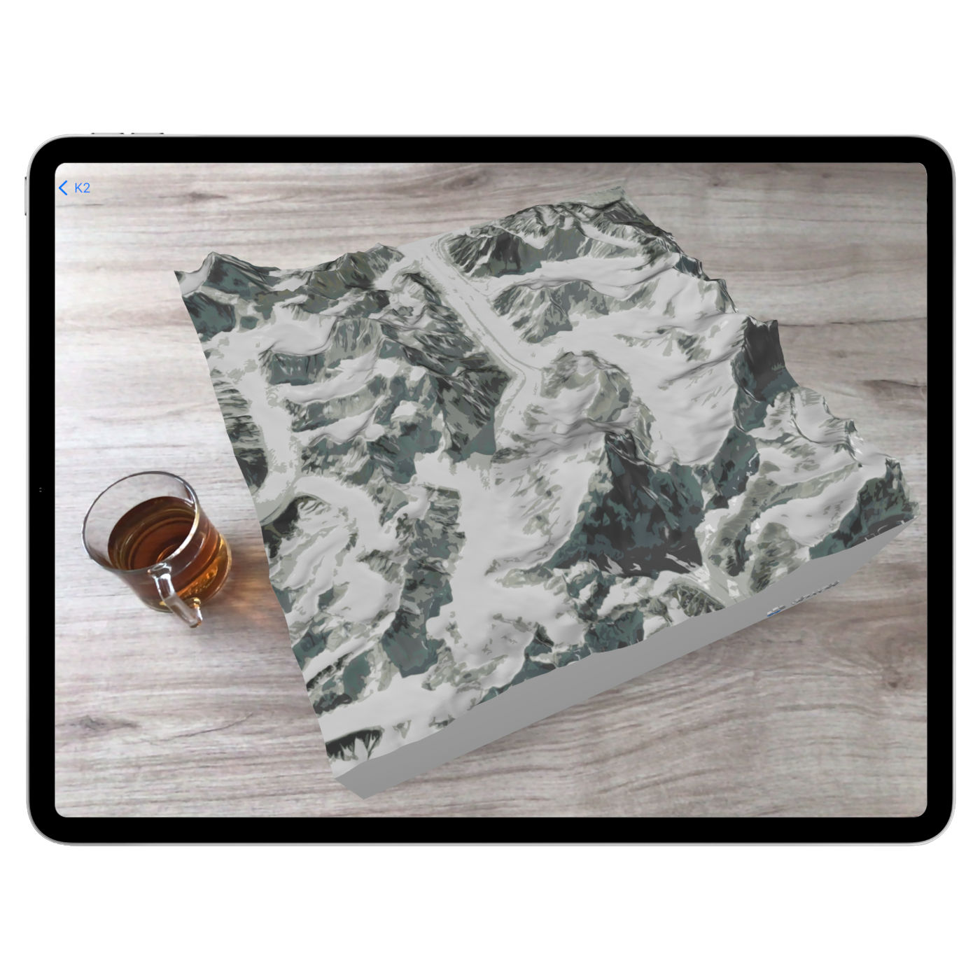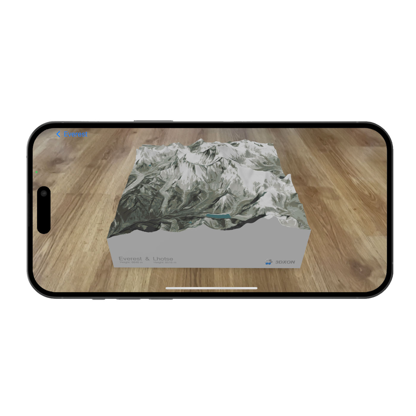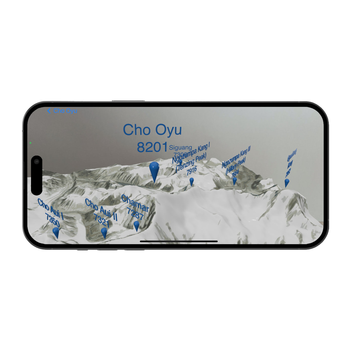 The AR peak model has a painted texture which resembles its natural look. Unlike the geographic maps, here you don't see any artificial labels stampped on the terrain. Instead you can toggle 3D AR markers to see geographic details as the peaks names.