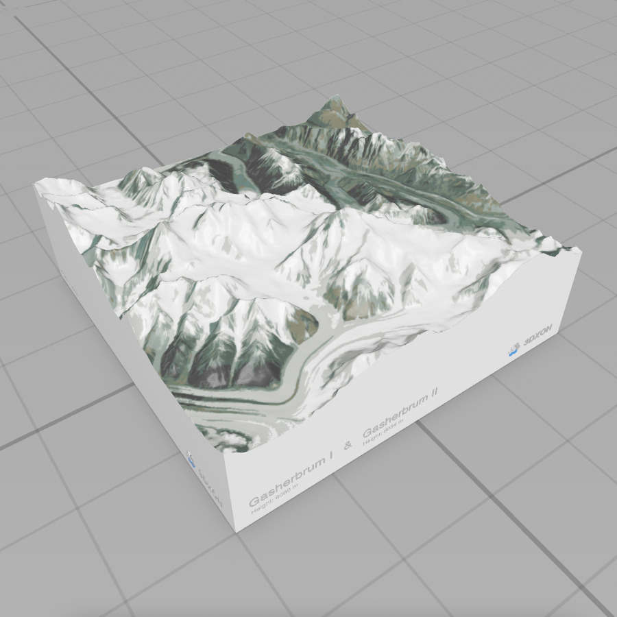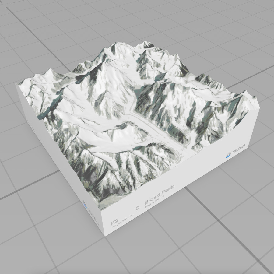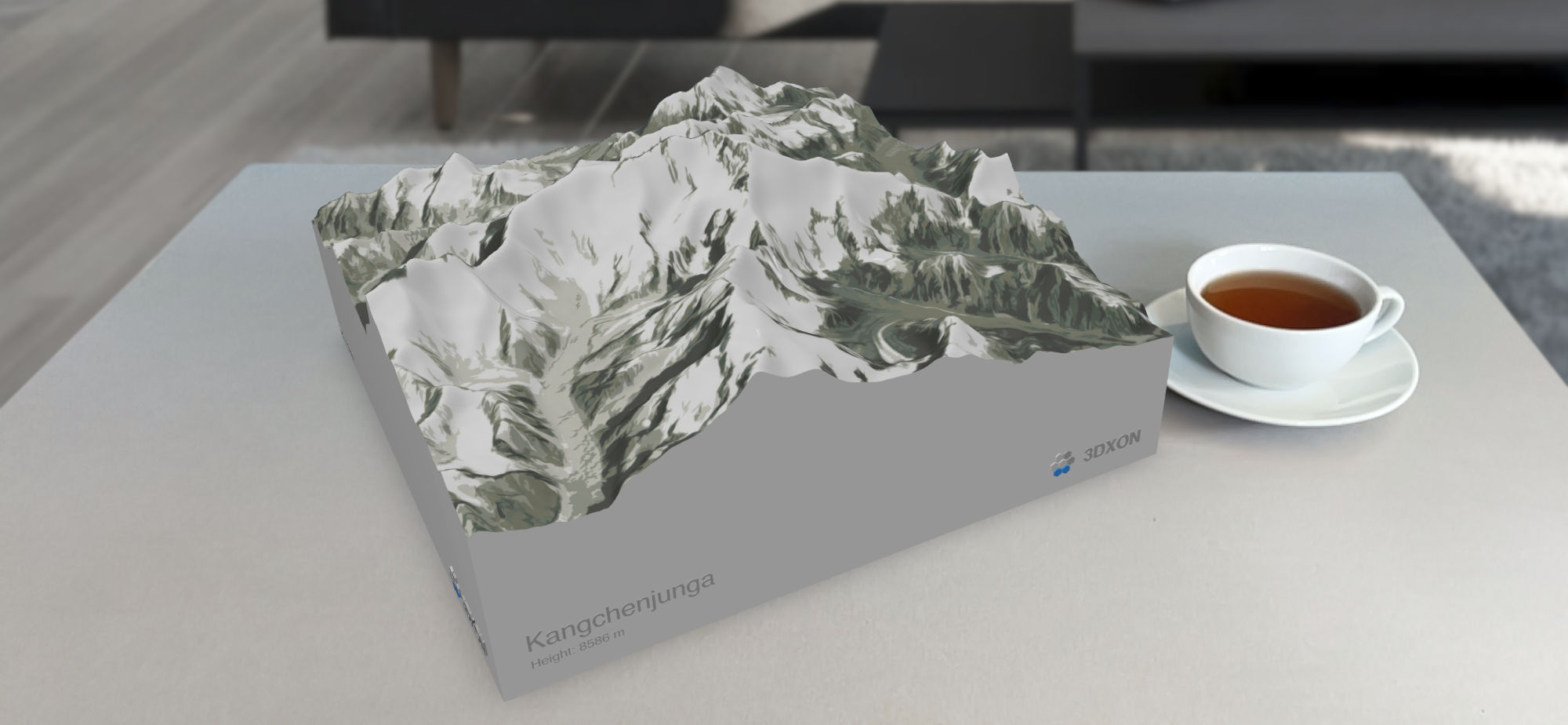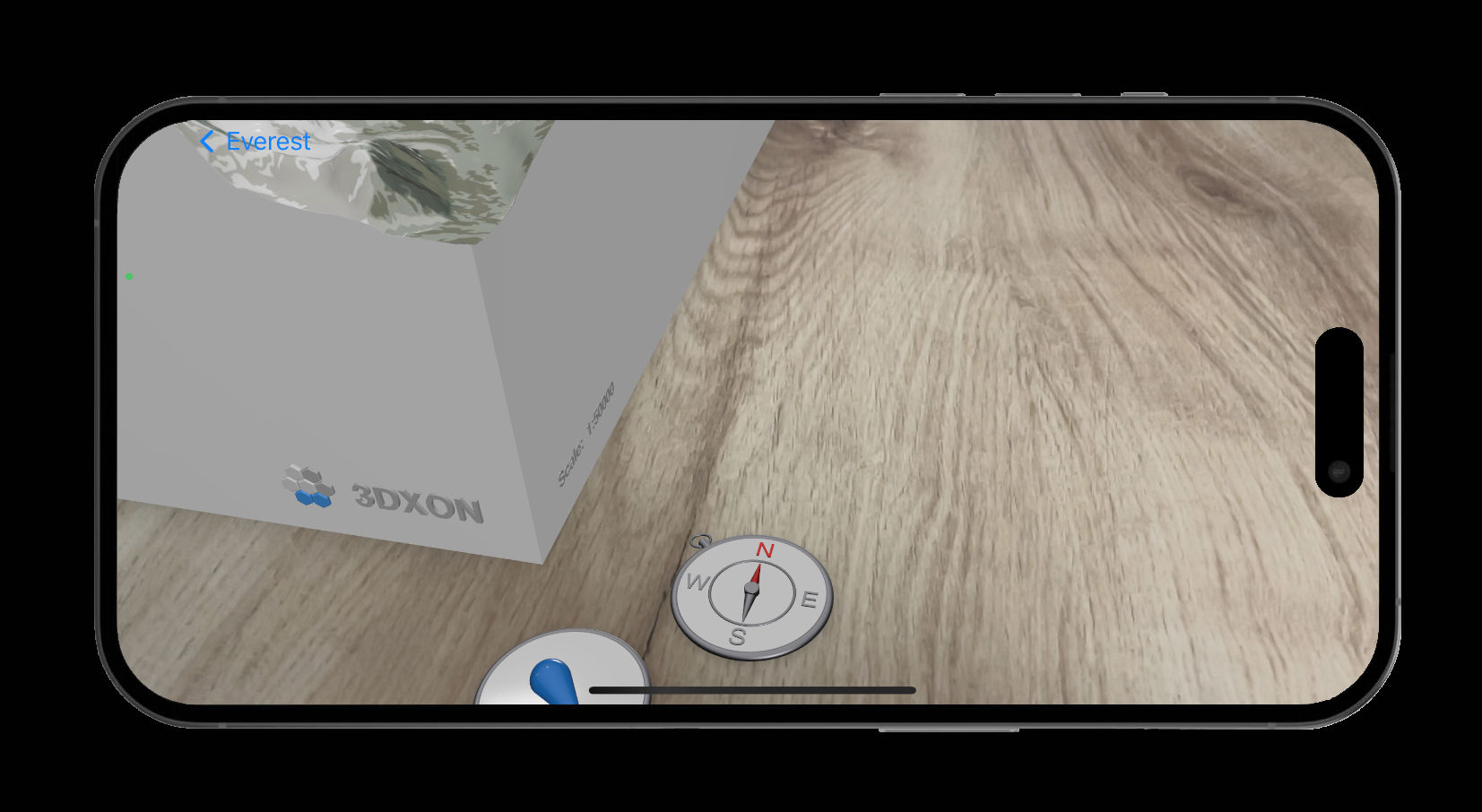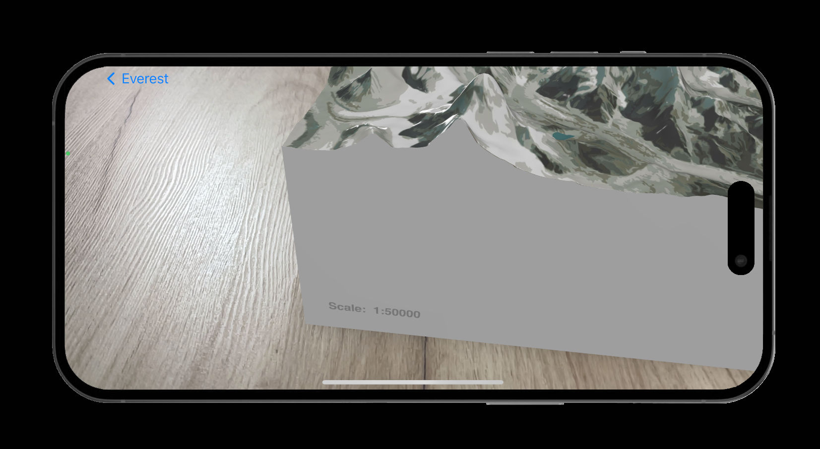 The AR peak model has a painted texture which resembles its natural look. Unlike the geographic maps, here you don't see any artificial labels stampped on the terrain. Instead you can toggle 3D AR markers to see geographic details as the peaks names.