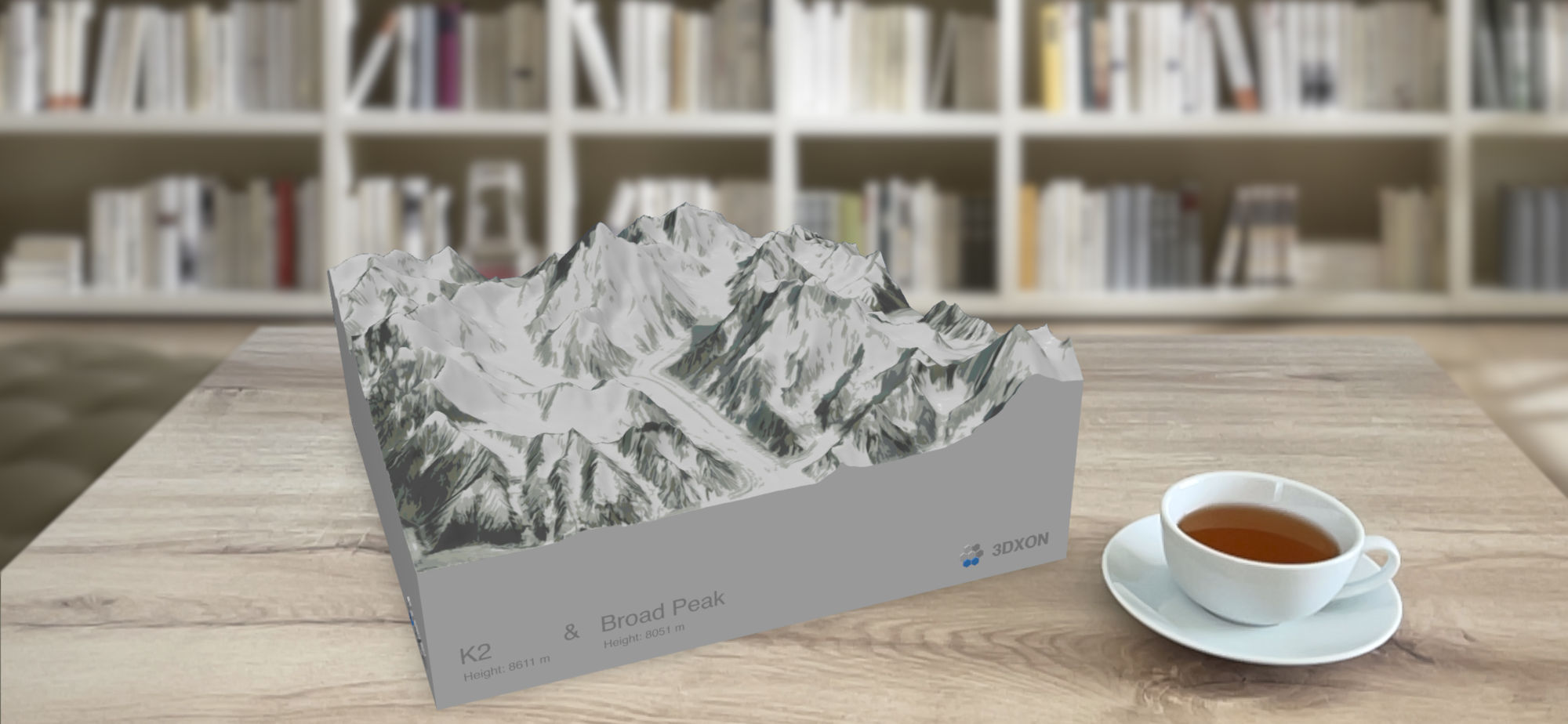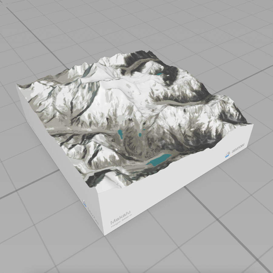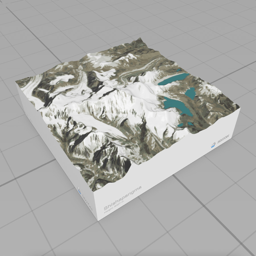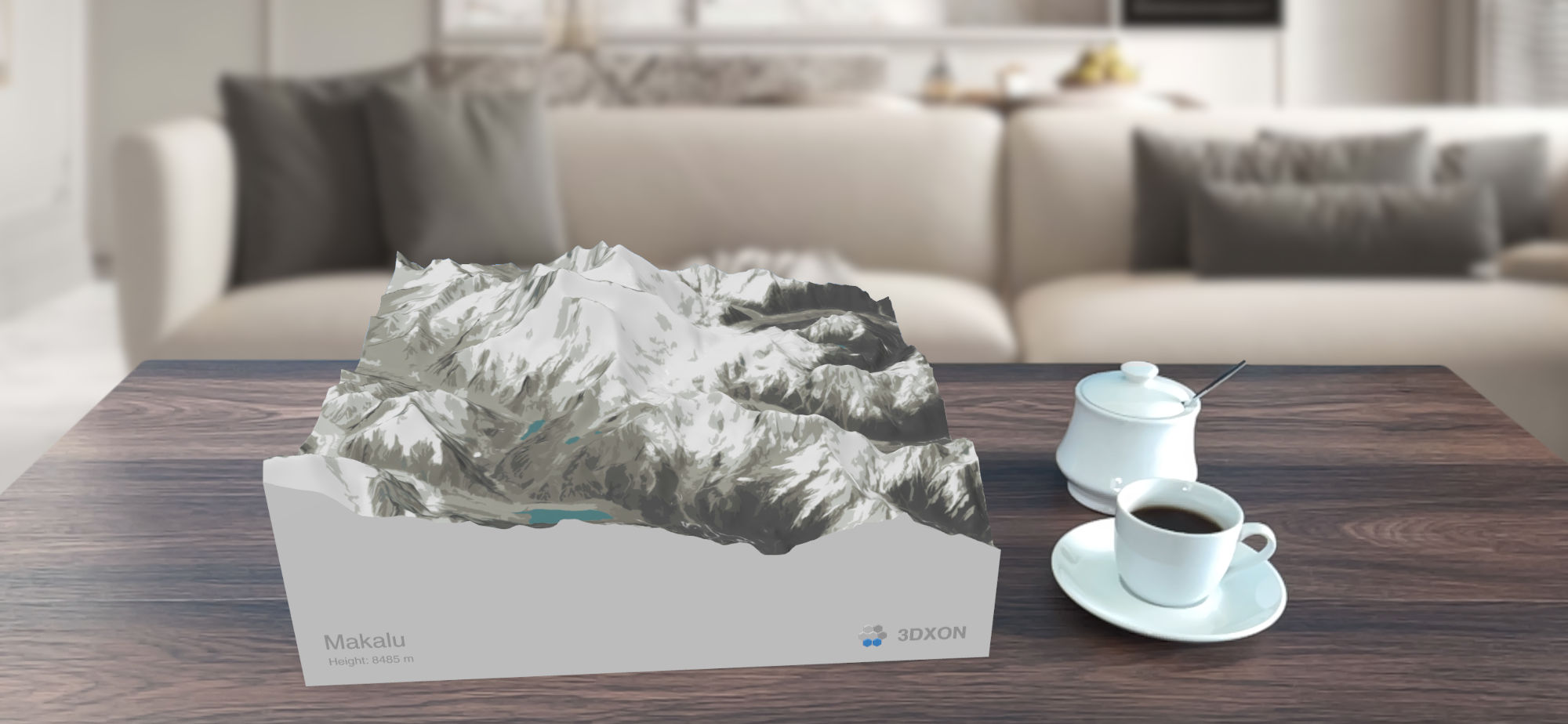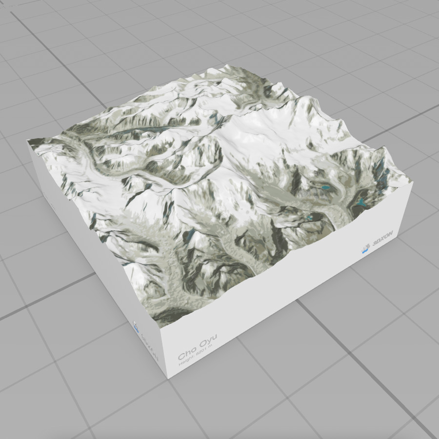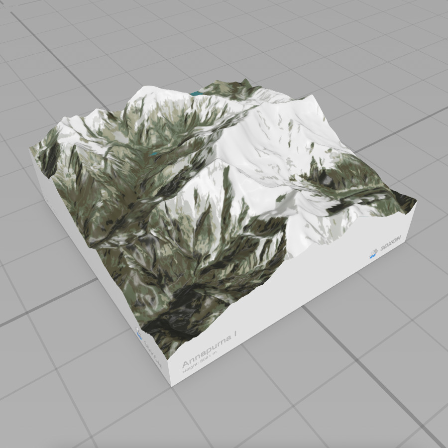 The AR peak model has a painted texture which resembles its natural look. Unlike the geographic maps, here you don't see any artificial labels stampped on the terrain. Instead you can toggle 3D AR markers to see geographic details as the peaks names.