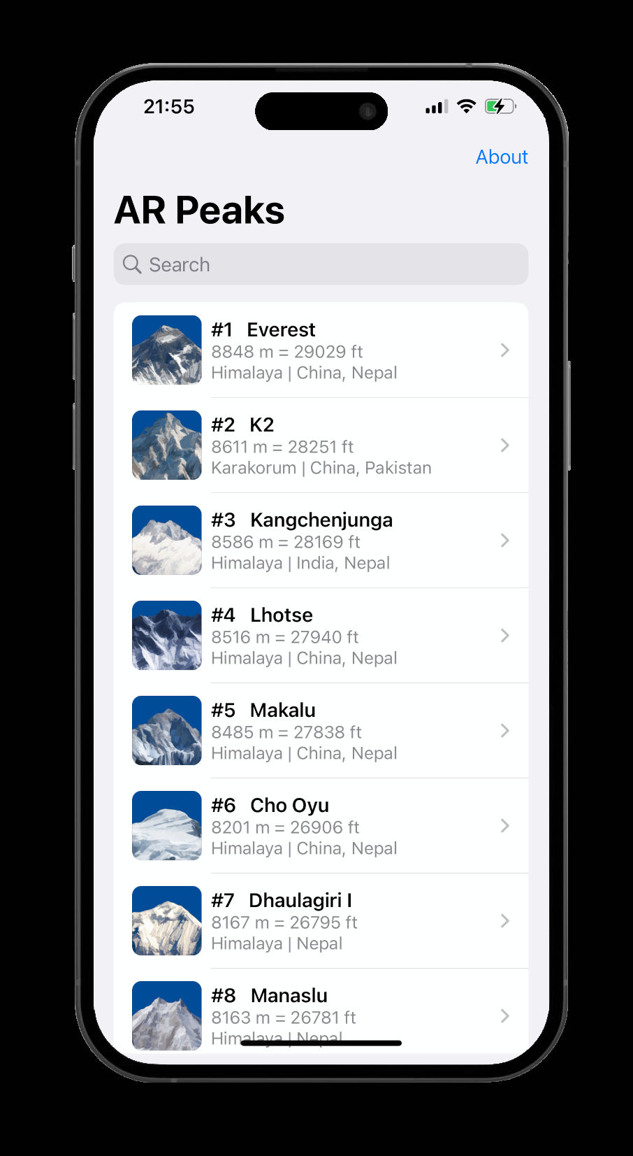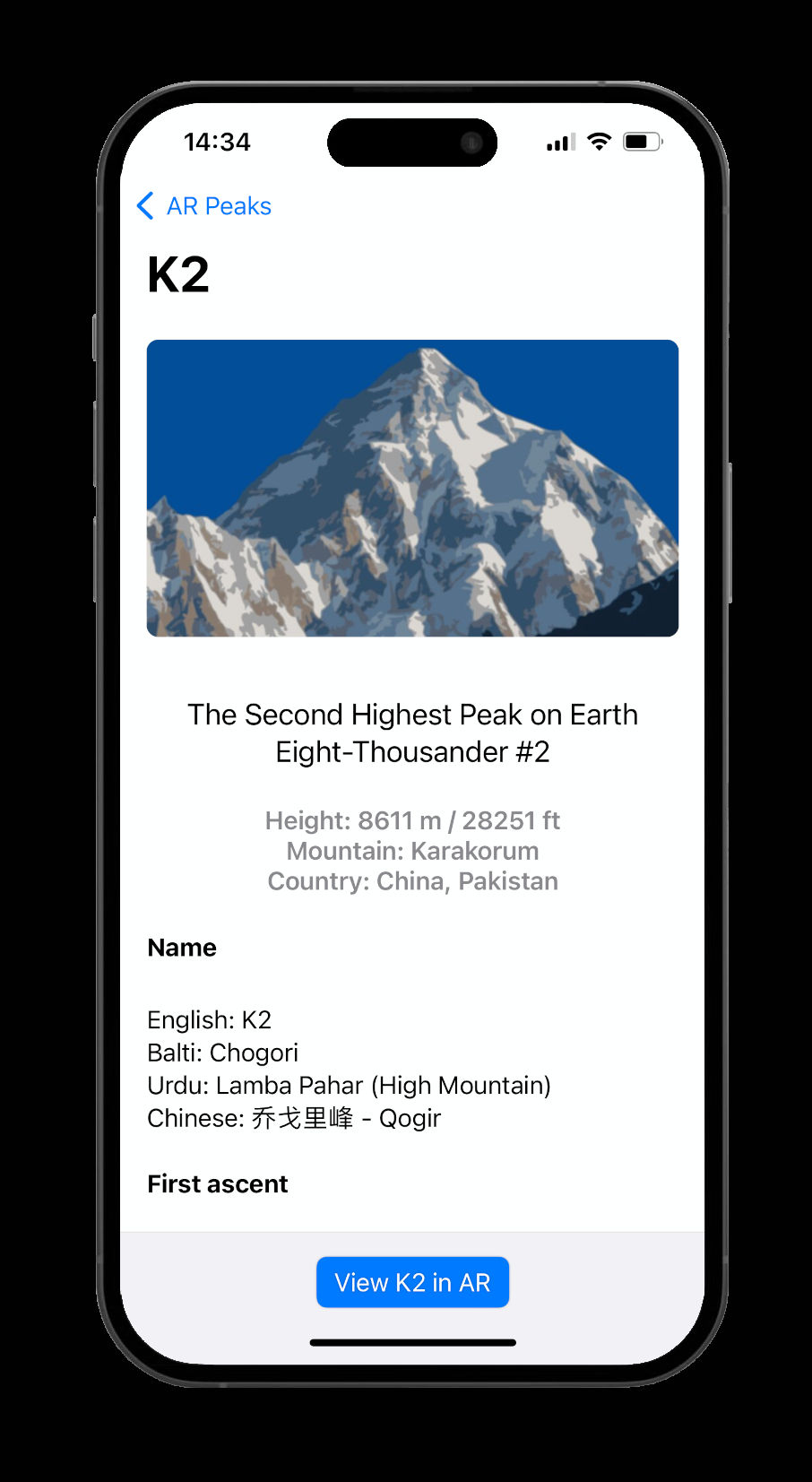 The first screen in the app displays a catalog of all the peaks models in the app. Selecting a peak opens its info screen.