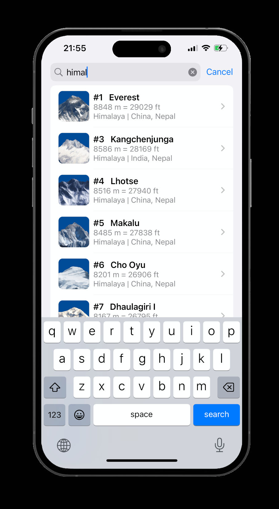 Search the catalog by typing a peak name, mountain, country or even peak height in meters or feet. The catalog is instantly filtered as you type.