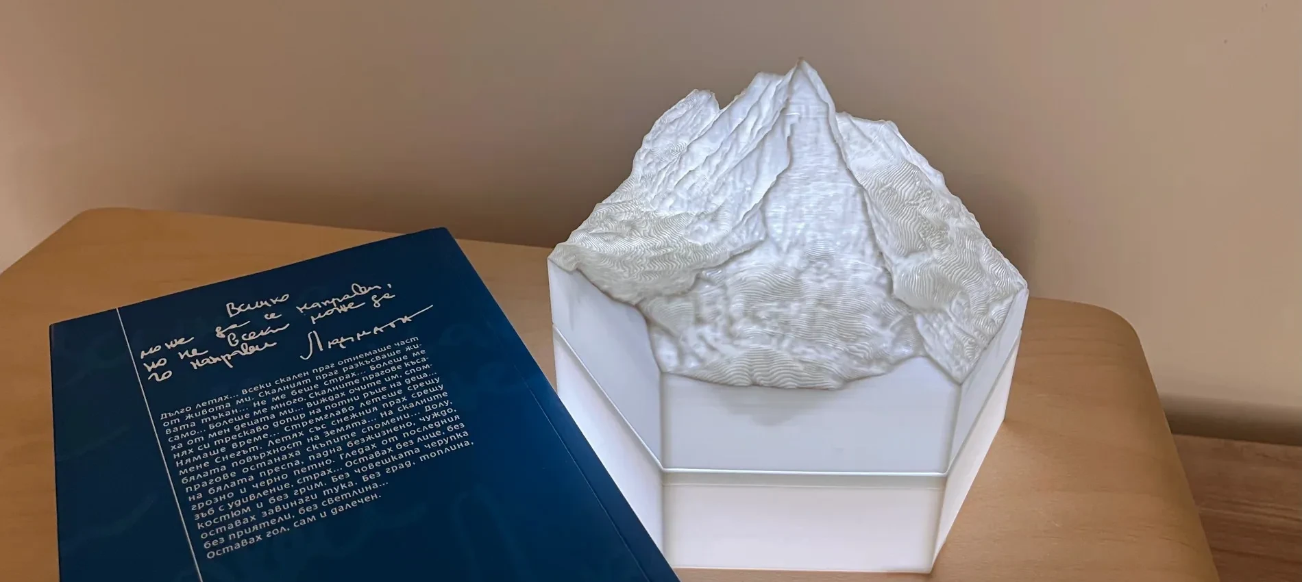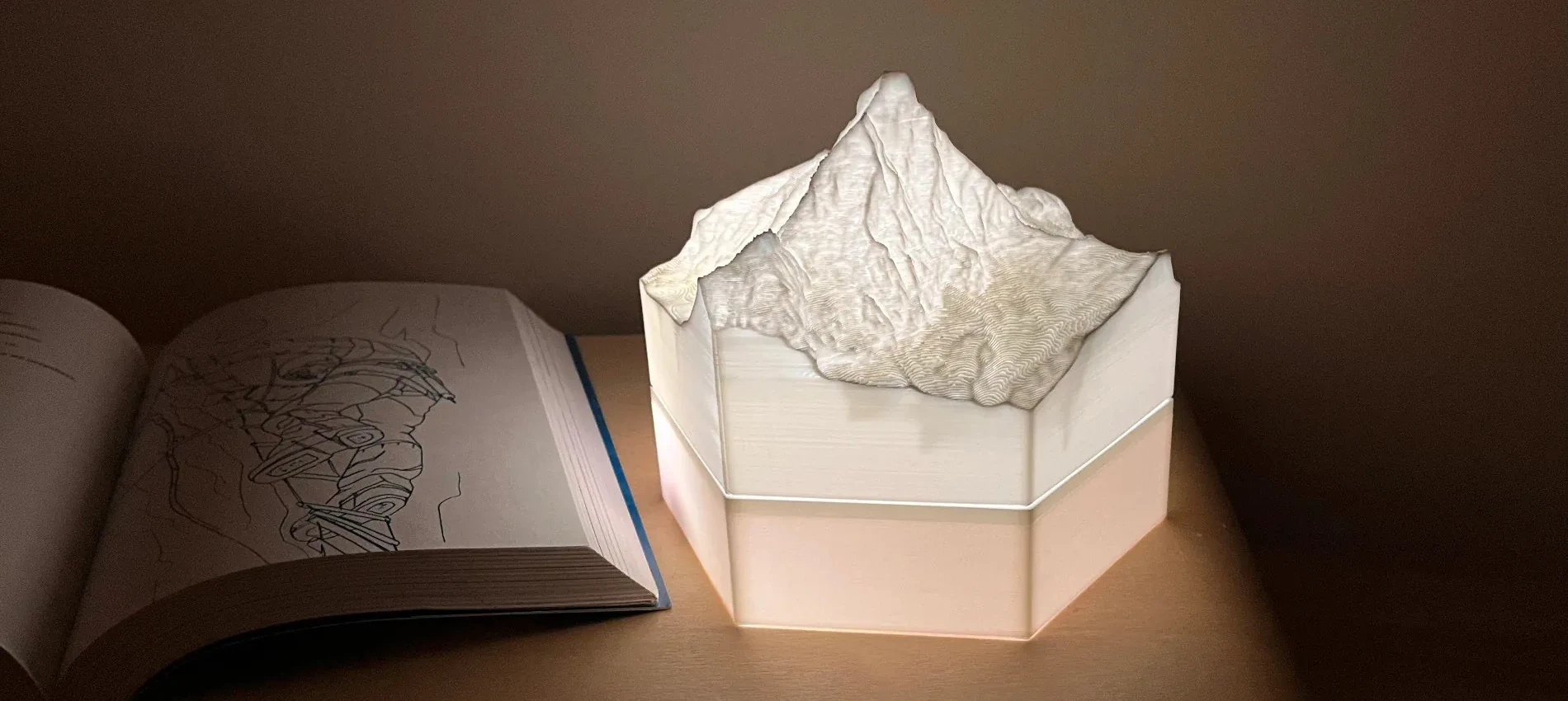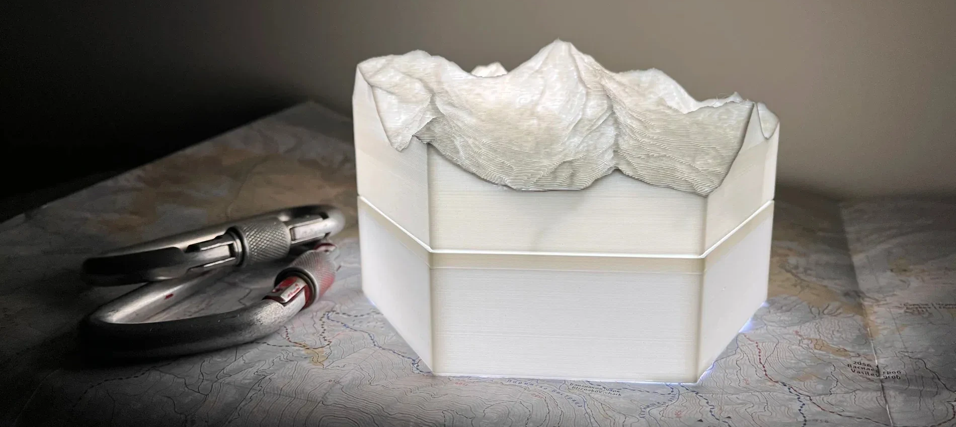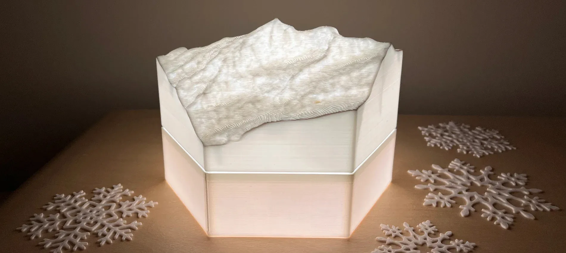 The terrain models are 3D-printed as hollow objects with minimalistic inside structure. This allows the models to be lighten up by LED lights behind them. It can be a single LED lamp for a model or LED strips for the whole installation.